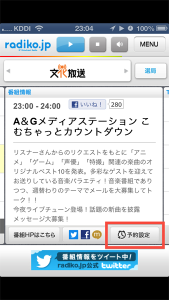 聴取中の番組の画面の右下「予約設定」をタップ