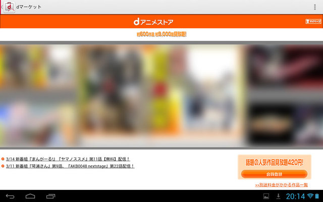 「dtab」で「dアニメストア」のトップページを表示したところ