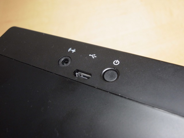 背面左から、アナログ入力のミニ端子、給電用のUSB microB端子、電源スイッチ