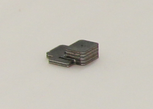 ローパスフィルターのパーツ。10枚の小型ステンレスプレートをレーザー溶接して成形
