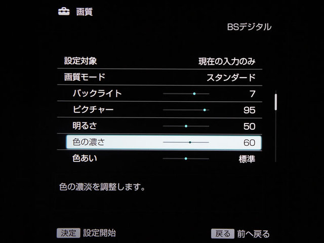 画質調整メニュー。モードを選ぶだけでなく各項目をそれぞれ好みに調整可能。黒補正やガンマ補正などの詳細設定も可能