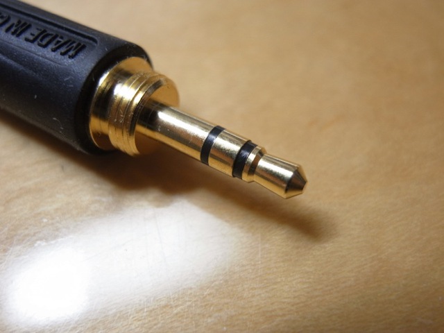 通常のヘッドホン出力プラグ。端子の金属部分が黒の樹脂のラインで絶縁され3つに分割されているが、そのそれぞれが右の+、左の+、左右共通のーとなっている