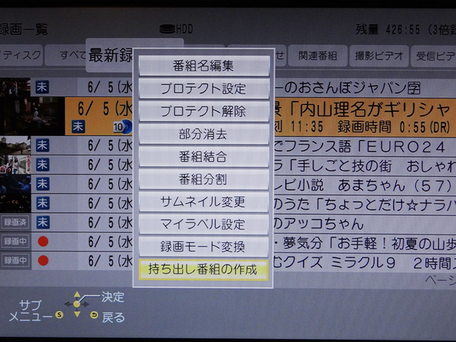 録画済みの番組から持ち出し番組ファイルを作成することもできる