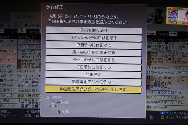 2度続けてボタンを押すと「予約修正」のメニューに移り、「動画転送アダプターへの持ち出し設定」が行える