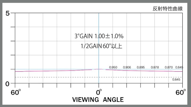 ピュアマットIIIでは、ユーザーの視聴位置やプロジェクターの設置位置に左右されず、同じクオリティで鑑賞できるマット型。ゲイン値は鑑賞に理想とされる1.0を実現している