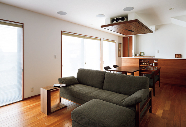 リビング後方はダイニングとカウン ターキッチンが続く。縦長にとられ たこの空間の約半分が掃き出し窓 となり、この部屋のどこからも陽の 光が注ぐ