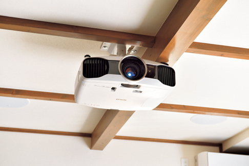 天井裏が狭く、 プロジェクターの配管スペースがなかったため、エプソンのワイヤレスモデル、E H - TW8000Wをチョイス。梁や金具の高さを計算しつつ、梁にかからないようなギリギリの位置に設置されている