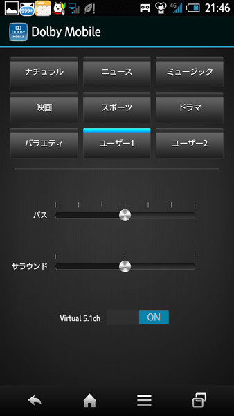 Dolby Mobileの設定画面。ユーザー設定も2件メモリーしておくことができる