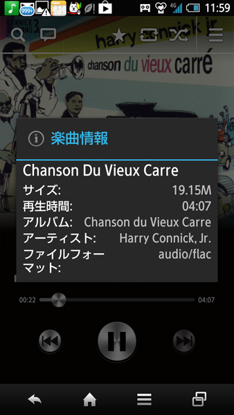 音楽再生時の楽曲情報画面。FLAC 44.1/16bitのファイルを再生できることを確認した