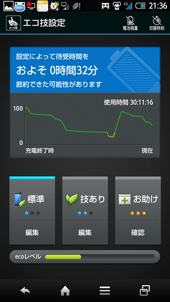 「エコ技」のメニュー画面。省エネ駆動のためのアドバイスも表示される