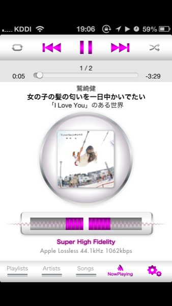再生中の画面。レベルメーターと再生中の音源の形式やスペックの表示が特徴