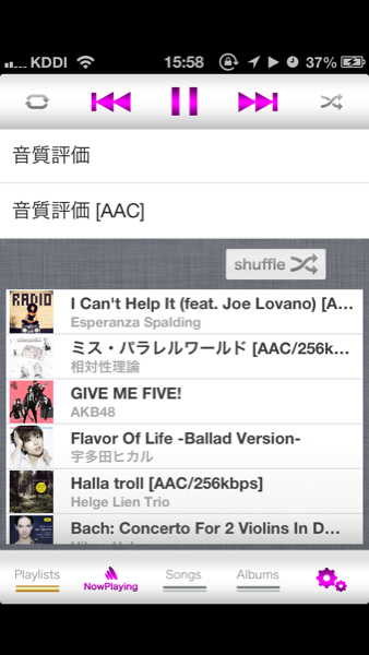ライブラリブラウズの画面。標準のミュージックアプリとは違い、プレイリストやアルバムをタップしても画面は移動せず、その画面の中で内容が表示される
