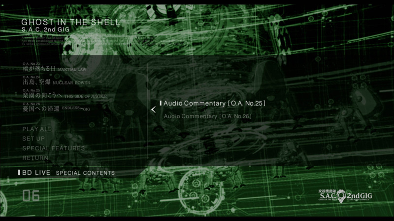 特典データのダウンロードが完了すると、メインメニューに「BD LIVE SPECIAL CONTENTS」のメニューが加わり、これを選択することでオーディオコメンタリーの選択が行える。