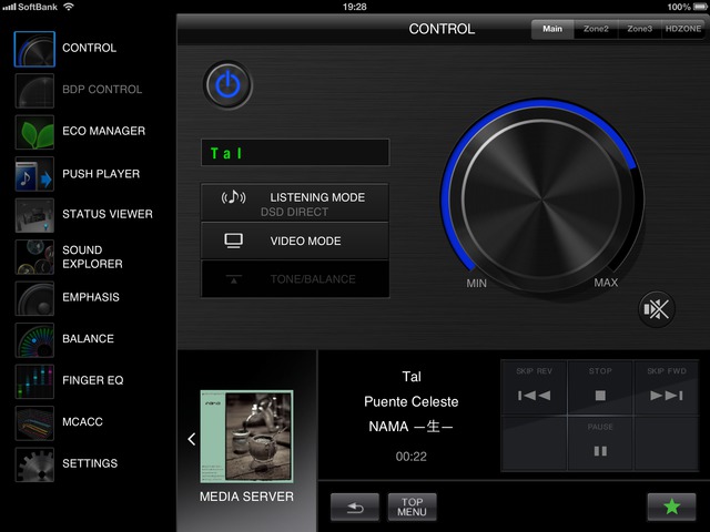 iPad版「iControlAV2013」の画面。SC-LX57でDSDネイティブ再生を行う場合、ピュアダイレクトモードを選択する必要がある