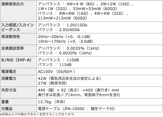 ラックスマンP-700uのスペック表記。さすが丁寧に一通りをしっかりと明記している(メーカー公式サイトより)
