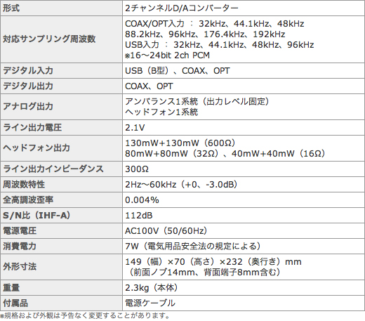 ラックスマンDA-100のスペック。サンプリング周波数の項目に注目(メーカー公式サイトより)