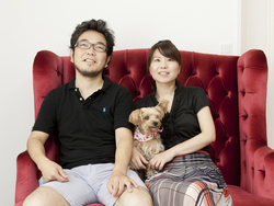 若尾逸郎さん(左)・幸子さん(右)夫妻と、犬のモコちゃん(真ん中)