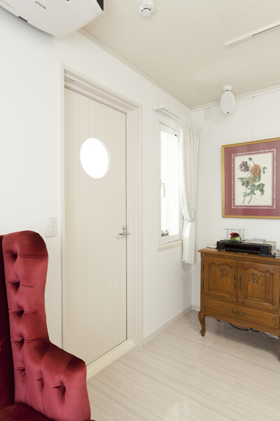 大建の「スタンダード★★防音(A防音)」を導入した。入り口側の防音ドア(左)と、天井の様子(右)
