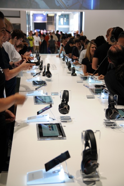 ソニーはXperia Z1を大量に並べて「ワンタッチリスニング」の手軽さをアピール。同コーナーは操作感と音を確認する来場者でいつも混雑していた。