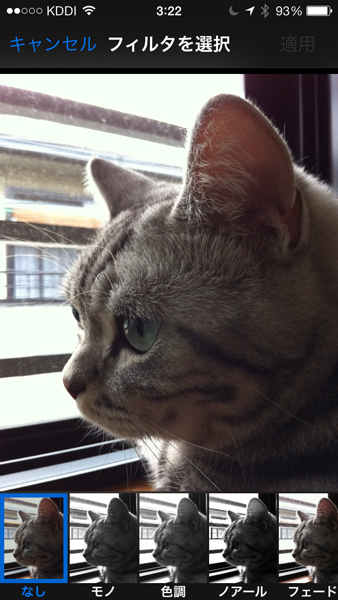 フィルターの適用例をいくつか載せておく(画面は「写真」アプリの編集画面)。まずこれがフィルターを適用していない生の状態