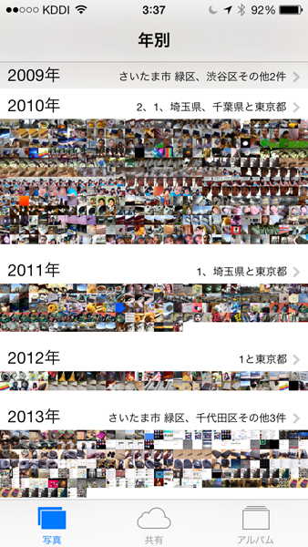 iOS7 では「イベント」「撮影地」表示がなくなって代わりに時系列を中心にした「写真」表示が追加された