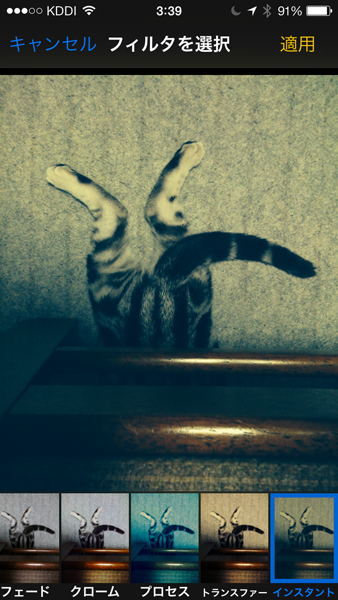 フィルター選択して効果を確認したら「適用」そしてカメラロールに「保存」する