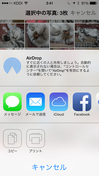 共有方法のトップにAirDropが表示される。…のだがAirDrop対応の他のiOS機器を持っていないので実行はできなかった…