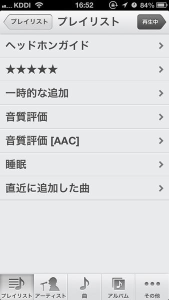 iOS 6の「プレイリスト」画面。プレイリスト名のテキスト表示だけで構成されている