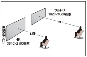 超高精細な4Kディスプレイでは、臨場感あふれるシーティングポジションは画面の高さ(H)×1.5と、フルHDの3Hに比べて半分の距離となる