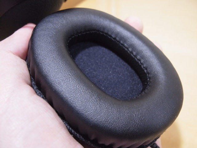 イヤーパッド側。革素材で肌触りがとてもよく、クッションの厚みもあるので装着感は快適