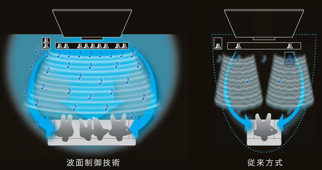 波面制御技術。部屋の形状に左右されず、密度あるエネルギッシュなサウンドが広いスイートスポットで楽しめる。複数人での同時視聴でも、全員がベストの条件で聴くことができる