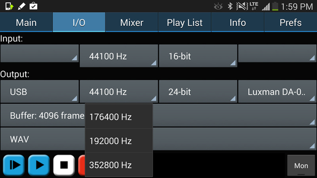 USB-DACとの接続に成功すると「I/O」のタブから受け側の機器が対応するサンプリングレート、ビットレートがプルダウンから選べるようになる
