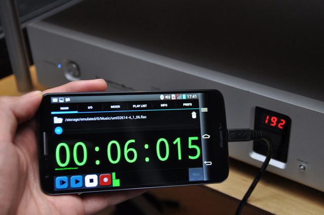 「USB Audio Recorder PRO」アプリから192kHz/24bitファイルを再生。D-06のインジケーターに192の表示が点灯した