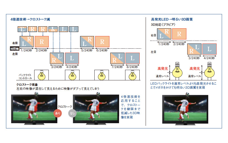 自然な立体感を実現するためには、左目用と右目用それぞれの映像を正確に伝えることが不可欠だ。左右の映像の混在を防ぐために、〈ブラビア〉の3D対応モデルは例外なく4倍速技術を投入しているが、それに加え、LEDバックライトの点灯・消灯を高速に制御し、かつ点灯時には通常よりも明るく光らせることによって、左右映像の混在(クロストーク)を事実上問題にならない程度にまで抑えることに成功するとともに、より明るい3D映像を映し出せるようになった。複数の被写体が異なる速度で素早く動くサッカーの画面を見ても、輪郭のずれや違和感のある動きを見せないのは大きな強みといえるだろう。