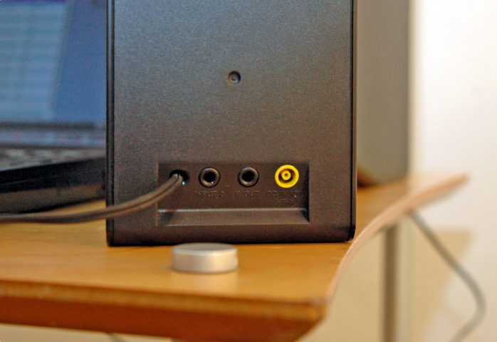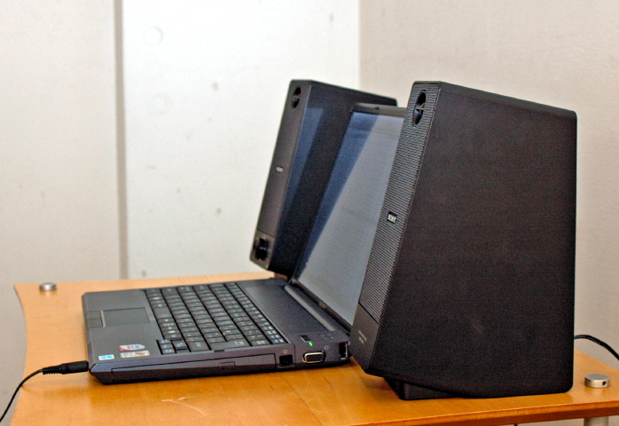今回の試聴で使用したノートパソコンの画面は12.1インチ。その両脇にスピーカーをセッティング。最もバランス良く聴けたのは、画面から約60センチあたり。まさにニアフィールドリスニング(近接試聴)に特化した製品である。また、本体をやや内側に向けるとさらにピンポイントで音像が安定する。その分、リスニングエリアは限られてしまうといえるだろう。