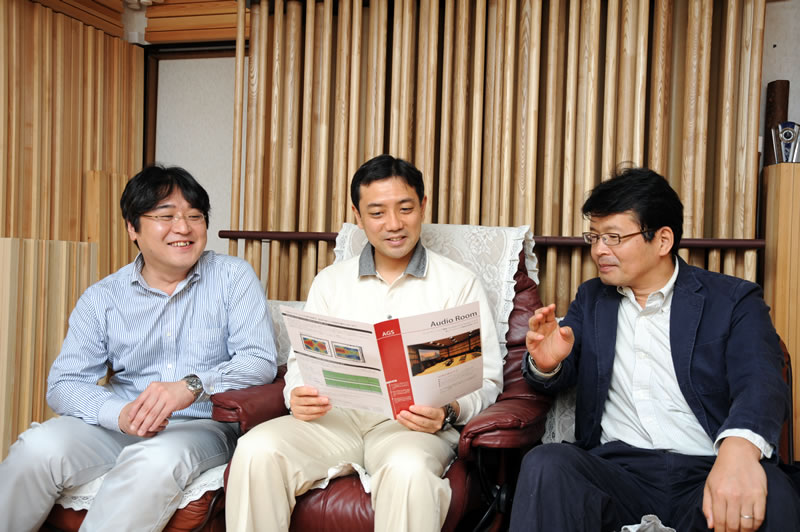 | 「アンク」や「シルヴァン」設置時には、希望があれば設置調整や音響測定もしてくれる。写真中央がオーナーの渋谷剛さん。写真左は日東紡音響エンジニアリングの佐古正人さん、右は山下晃一さん。バックに見えるのは、部屋の後面に設置されたAGS。壁全体を受注オーダーメイドでチューニングするシステム |