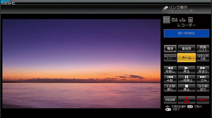 | 「AQUOSファミリンクII」で「ファミリンクパネル」を表示したところ。画面上の操作ボタンを使って、テレビのリモコンで対応機器を操作できる |