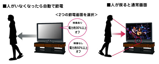 | 「ムーブセンサー」による節電機能のイメージ図。映像ありと映像なし、2種類の節電画面を選択できる |