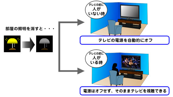 | 明るさセンサーとムーブセンサーを連携させた新機能「照明オフ連動」。照明を落とすと自動的にテレビの電源を切る、といった使い方ができる |