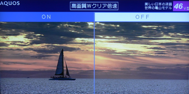 搭載しているパネル自体はAQUOS EXラインと同等とのことだが、パネルのポテンシャルが引き出されると、画質がこれほど変貌するものかと驚きを禁じ得なかった。高速にパンする映像で動画解像度をチェックすると、「Wクリア倍速」の効果により撮影時のぼやけが効果的に除去されていることが実感でき、その映像のキレ味は特筆できる。残像感が目に見えて解消する効果は、他社の最新の倍速駆動に比べても高いレベルにある。
