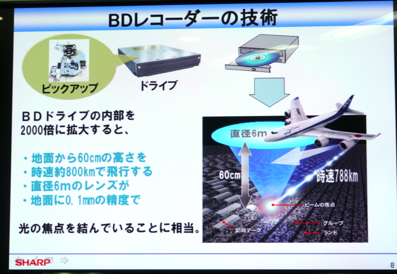 今回、AQUOSブルーレイがレコーダーとして初めて採用した新規格「BDXL」では、1枚のディスクに最大128GBものデータを記録できる。これに必要な精度は、まさにナノの世界だ。BDレコーダーで使われている技術の精度を、分かりやすく2,000倍のスケールで表現すると、地上60cmを時速800kmで飛行するジェット機から、2cm間隔で積層された各層に、0.1mmの精度でアクセスしてデータの書き込みや読み出しを行うことに相当する。