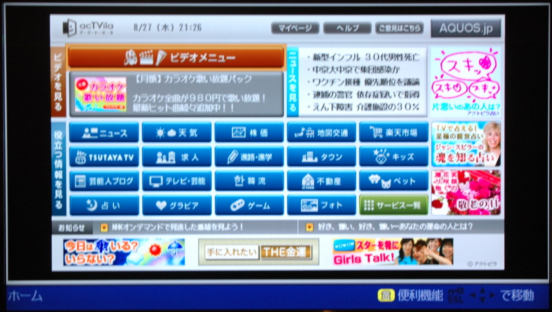 ネット機能では、同社オリジナルのポータルサイト「AQUOS.jp」が利用できる点が最大の特徴として挙げられる。AQUOS.jpからは、これも同社専用のサービス「Yahoo! JAPAN for AQUOS」にアクセスすることができる。