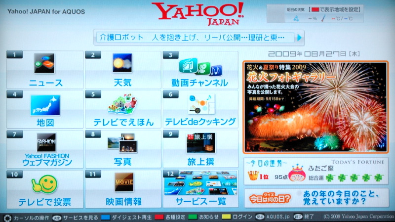 「Yahoo! JAPAN for AQUOS」のトップページ。各コンテンツへはリモコンの数字キーでダイレクトにアクセス可能 |