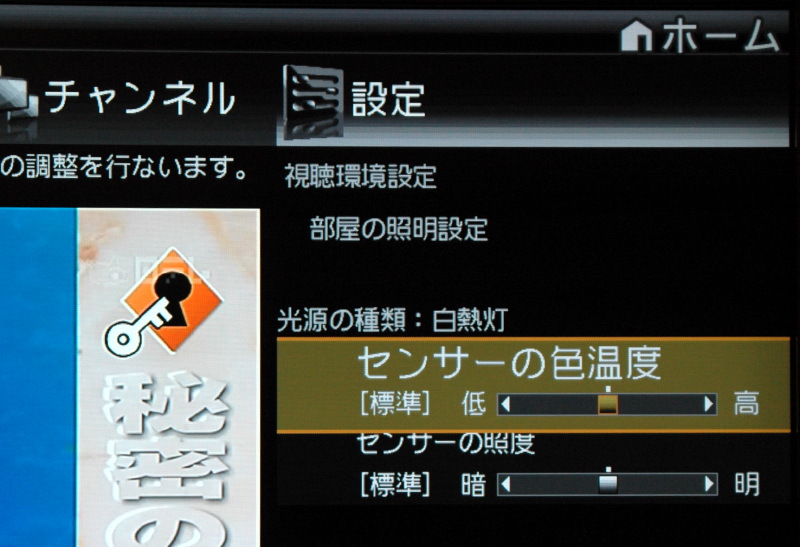 また一般的なリビングでは、照明の種類も白熱灯や蛍光灯など室内環境にバラつきがある。DX2の明るさセンサーの威力はここでも発揮され、前述の外光のほか、照明の明るさと色味で、外光・蛍光灯・白熱灯・暗室と、4段階で部屋の照明の状況を判別し、それにあわせて画質を自動調整する。色温度設定を例に取ると、蛍光灯ではクールな画質とし、白熱灯では、より落ち着いた色味に合わせる。さらに照明を落とした寝室や個室などで、真っ暗な部屋で視聴する場合は、色温度を低くして、よりシネマライクな映像に調整する。