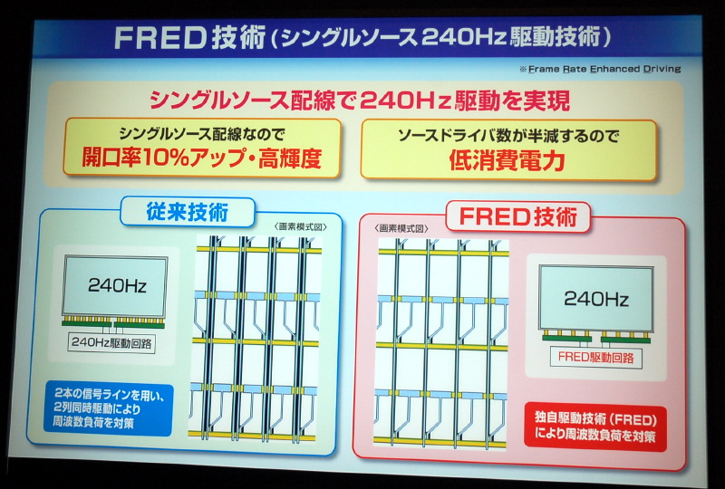 4つめの注目技術はFRED(Frame Rate Enhanced Driving)と呼ばれる、パネル駆動回路の改良である。これは、従来は2本必要だった信号ラインを1本に減らすことで消費電力を大きく抑える効果とともに、配線幅が半減することで光の損失を抑えることができ、ここでも従来に比べて約10%の明るさ向上を果たしているという。