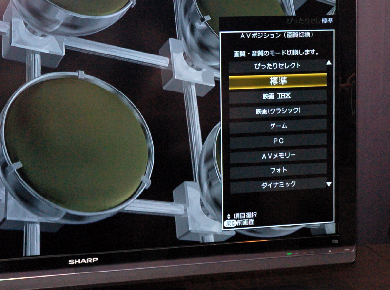 | LV3ラインには多数のAVポジションが用意されている。「ぴったりセレクト」を選べば、視聴環境や番組の内容に応じて自動的に最適な設定に調整してくれる |