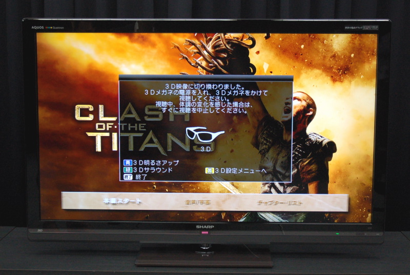 専用の3Dメガネをかけ、『タイタンの戦い』など複数の3Dコンテンツを映画(3D)モードで視聴した。3D視聴でよく話題になる明るさについては、やはり他の3Dテレビに比べて優位性を実感する。この明るさであれば、照明を抑えたリビングルーム程度の環境ではまず不満を感じることはないはずだ。