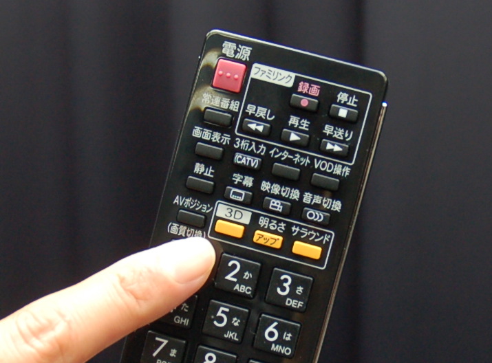 | リモコンには3D関連のダイレクトボタンを装備。画面が暗いと感じたら「明るさアップ」ボタンを押せば良い |