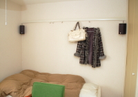 まずフロントスピーカー2チャンネルを部屋の左右に設置。NS-210シリーズは横幅約10cmとスリムサイズで、違和感なく部屋に馴染んでくれた。しかも軽い!これなら女性でも軽々と持ち運ぶことができる。さてバックに設置するリアスピーカーだが、当初の予定では別途スピーカースタンドを用意してその上に設置しようとしていたが、部屋のちょうどいい場所に可動式のハンガー掛けがあったので、スピーカーにフックを取り付けて壁掛けすることにした。