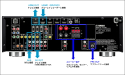 続いてAX-V465にBDレコーダーとテレビ、Wii、そして5.1chスピーカーを接続する。一見難しそうにみえるが、AX-V465の背面端子部は機能を厳選したシンプルな作りになっており、繋ぐ場所がわかりやすい。今回は下記のとおり接続を行った。